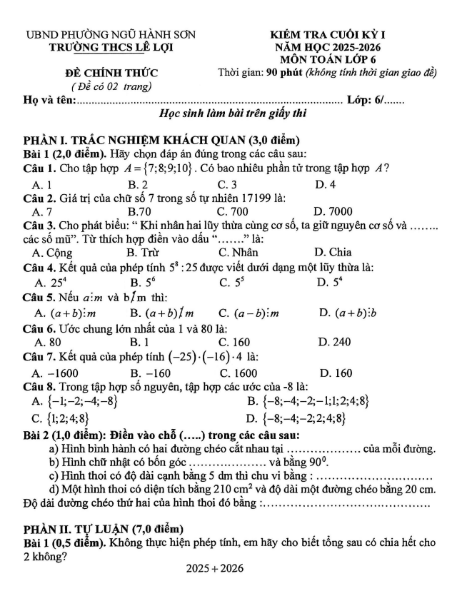 Đề cuối kỳ 1 Toán 6 năm 2025 – 2026 trường THCS Lê Lợi – Đà Nẵng 04/01/2026