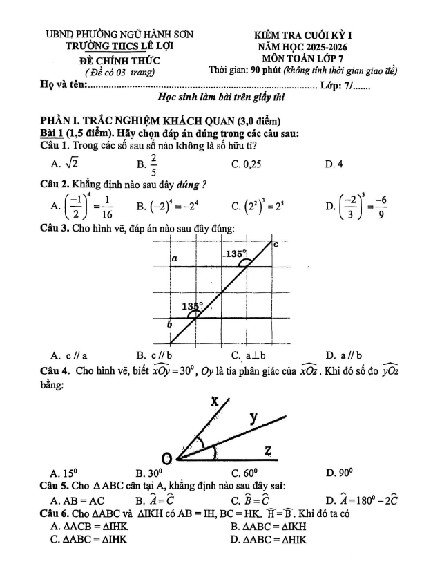 Đề cuối kỳ 1 Toán 7 năm 2025 – 2026 trường THCS Lê Lợi – Đà Nẵng 04/01/2026