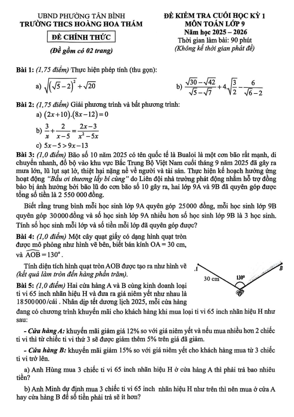 Đề cuối học kỳ 1 Toán 9 năm 2025 – 2026 trường THCS Hoàng Hoa Thám – TP HCM 06/01/2026