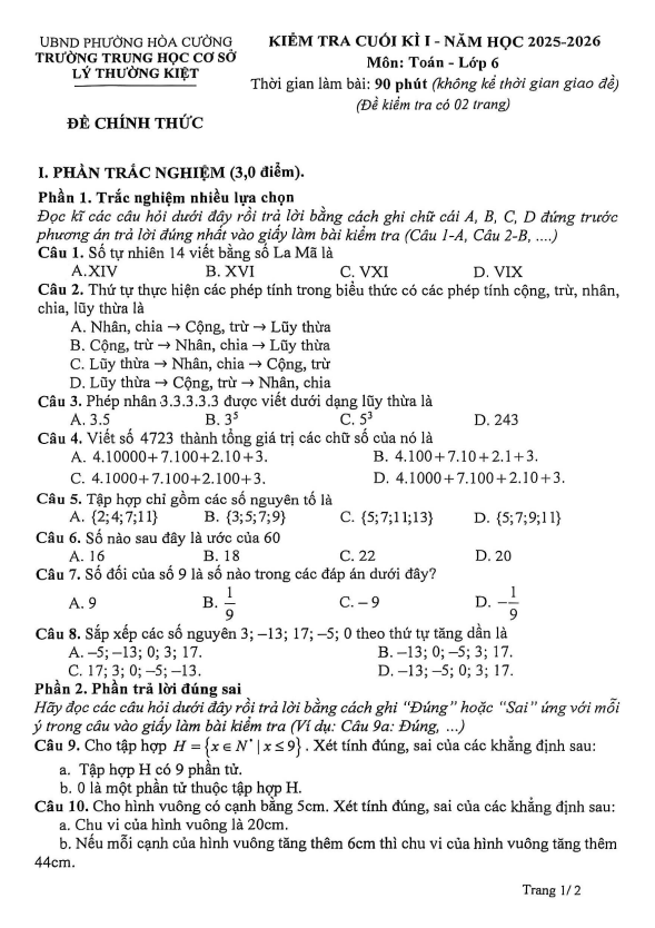 Đề cuối kì 1 Toán 6 năm 2025 – 2026 trường THCS Lý Thường Kiệt – Đà Nẵng 06/01/2026
