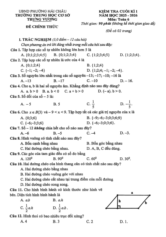 Đề cuối kì 1 Toán 6 năm 2025 – 2026 trường THCS Trưng Vương – Đà Nẵng 06/01/2026