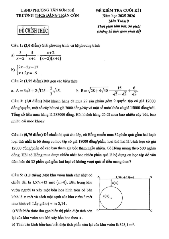 Đề cuối kì 1 Toán 9 năm 2025 – 2026 trường THCS Đặng Trần Côn – TP HCM 06/01/2026