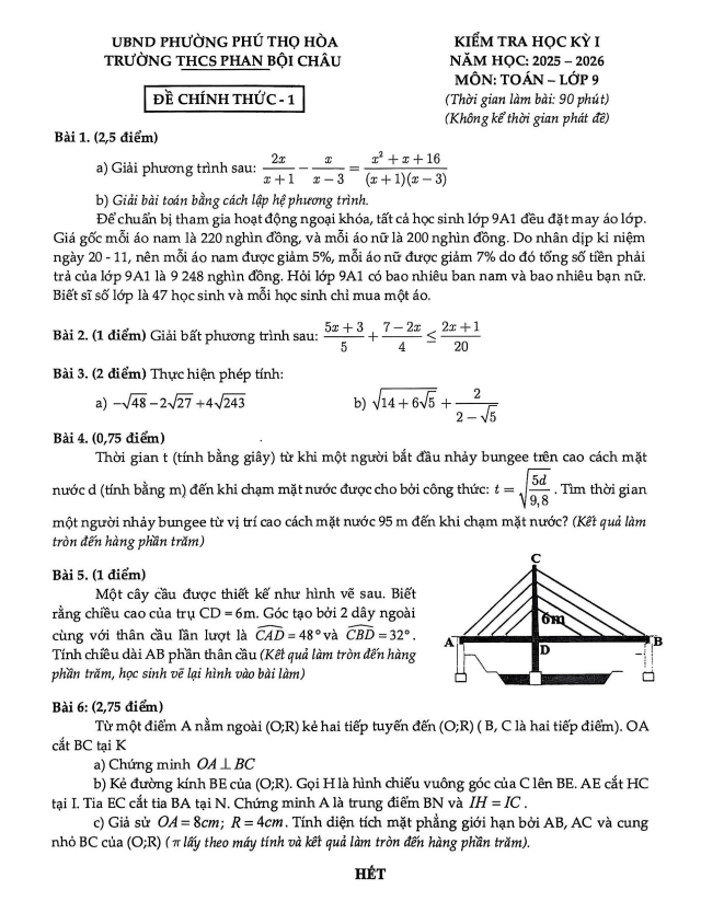 Đề học kỳ 1 Toán 9 năm 2025 – 2026 trường THCS Phan Bội Châu – TP HCM 06/01/2026