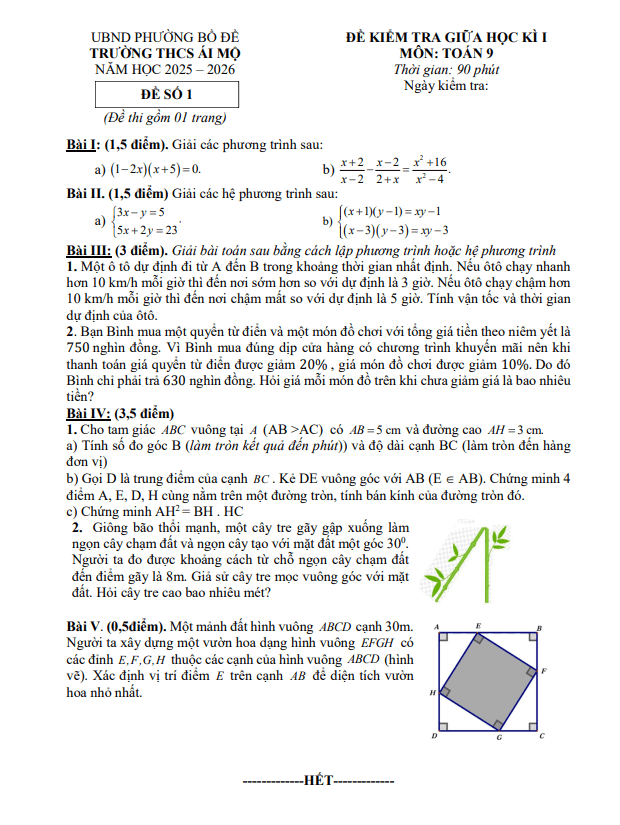 Đề Thi Giữa HK1 Toán 9 Đề giữa học kì 1 Toán 9 năm 2025 – 2026 trường THCS Ái Mộ – Hà Nội