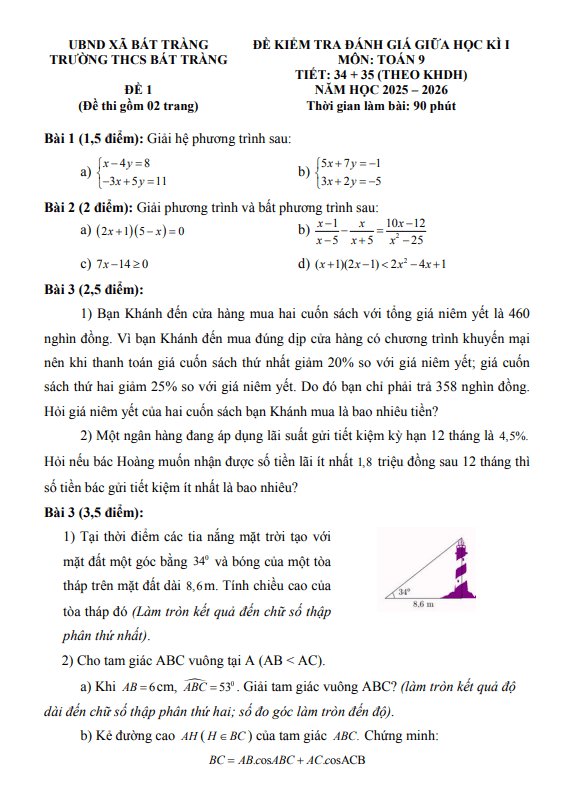 Đề Thi Giữa HK1 Toán 9 Đề giữa học kì 1 Toán 9 năm 2025 – 2026 trường THCS Bát Tràng – Hà Nội