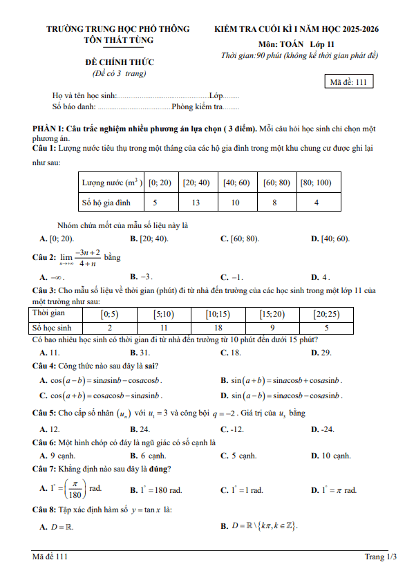 Đề cuối kì 1 Toán 11 năm 2025 – 2026 trường THPT Tôn Thất Tùng – Đà Nẵng 28/12/2025