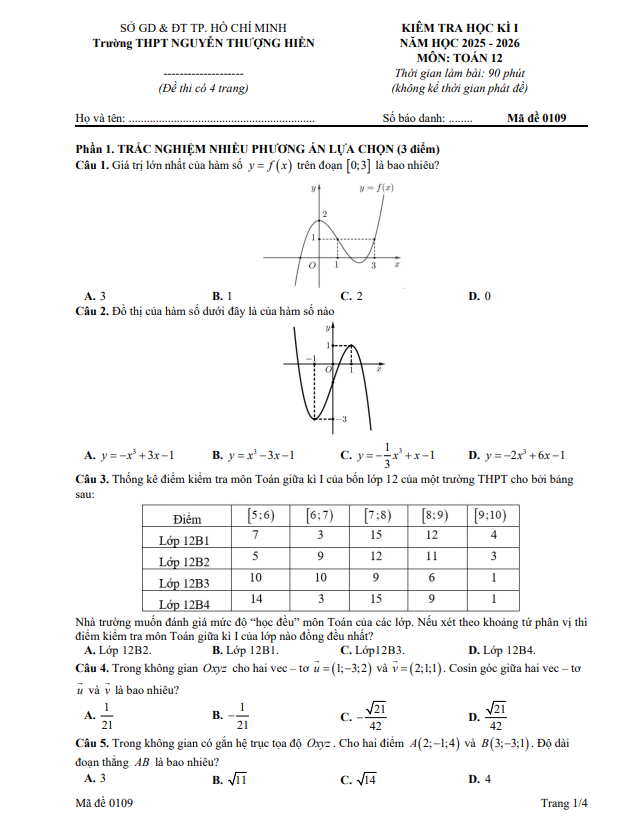 Đề học kì 1 Toán 12 năm 2025 – 2026 trường THPT Nguyễn Thượng Hiền – TP HCM 28/12/2025