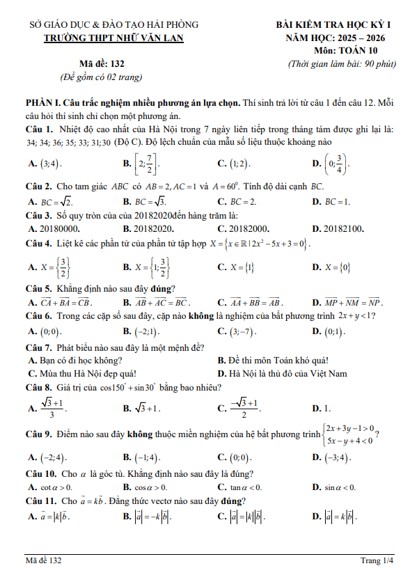 Đề học kỳ 1 Toán 10 năm 2025 – 2026 trường THPT Nhữ Văn Lan – Hải Phòng 28/12/2025