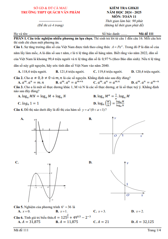 Đề Thi Giữa HK2 Toán 11 Đề GHK2 Toán 11 năm 2024 – 2025 trường THPT Quách Văn Phẩm – Cà Mau