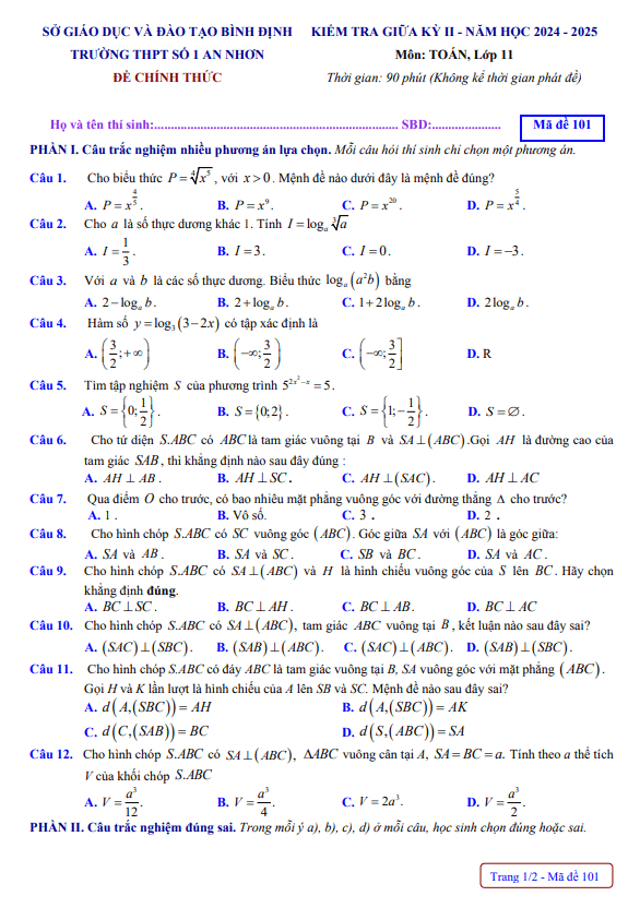 Đề Thi Giữa HK2 Toán 11 Đề giữa kỳ 2 Toán 11 năm 2024 – 2025 trường THPT số 1 An Nhơn – Bình Định