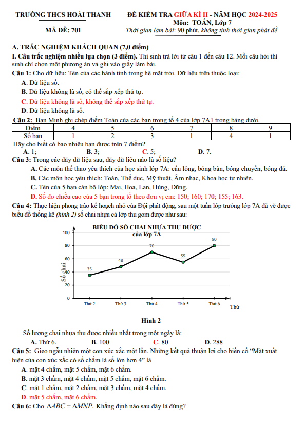 Đề Thi Giữa HK2 Toán 7 Đề giữa học kì 2 Toán 7 năm 2024 – 2025 trường THCS Hoài Thanh – Bình Định