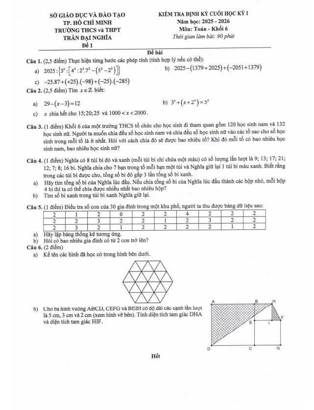 Đề cuối học kỳ 1 Toán 6 năm 2025 – 2026 trường Trần Đại Nghĩa – TP HCM 28/12/2025