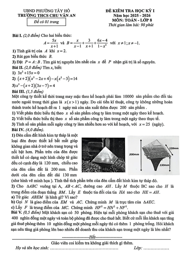 Đề học kỳ 1 Toán 8 năm 2025 – 2026 trường THCS Chu Văn An – Hà Nội 28/12/2025