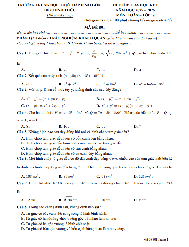 Đề học kỳ 1 Toán 8 năm 2025 – 2026 trường Thực hành Sài Gòn – TP HCM 28/12/2025