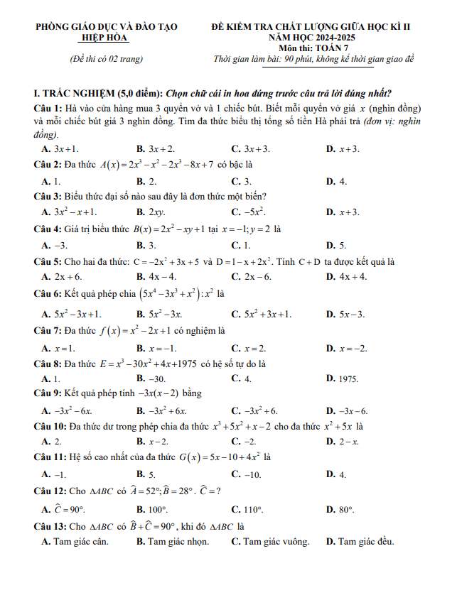 Đề Thi Giữa HK2 Toán 7 Đề giữa học kì 2 Toán 7 năm 2024 – 2025 phòng GD&ĐT Hiệp Hòa – Bắc Giang