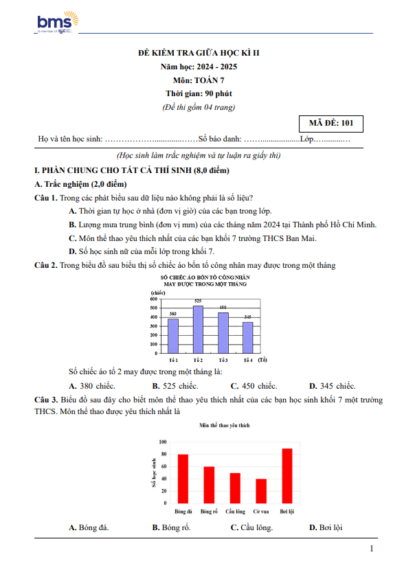Đề Thi Giữa HK2 Toán 7 Đề giữa học kì 2 Toán 7 năm 2024 – 2025 trường Ban Mai School – Hà Nội