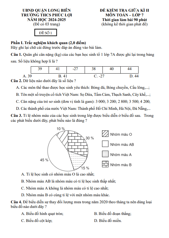 Đề Thi Giữa HK2 Toán 7 Đề giữa học kì 2 Toán 7 năm 2024 – 2025 trường THCS Phúc Lợi – Hà Nội