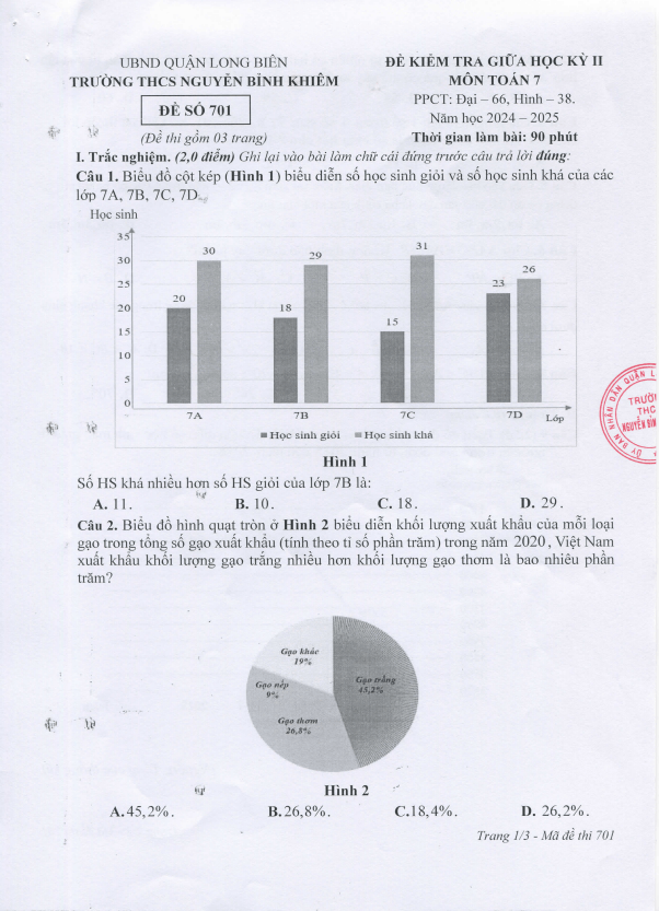 Đề Thi Giữa HK2 Toán 7 Đề giữa học kỳ 2 Toán 7 năm 2024 – 2025 trường THCS Nguyễn Bỉnh Khiêm – Hà Nội