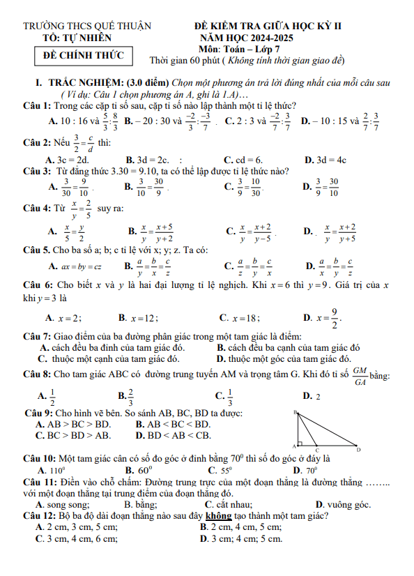 Đề Thi Giữa HK2 Toán 7 Đề giữa học kỳ 2 Toán 7 năm 2024 – 2025 trường THCS Quế Thuận – Quảng Nam