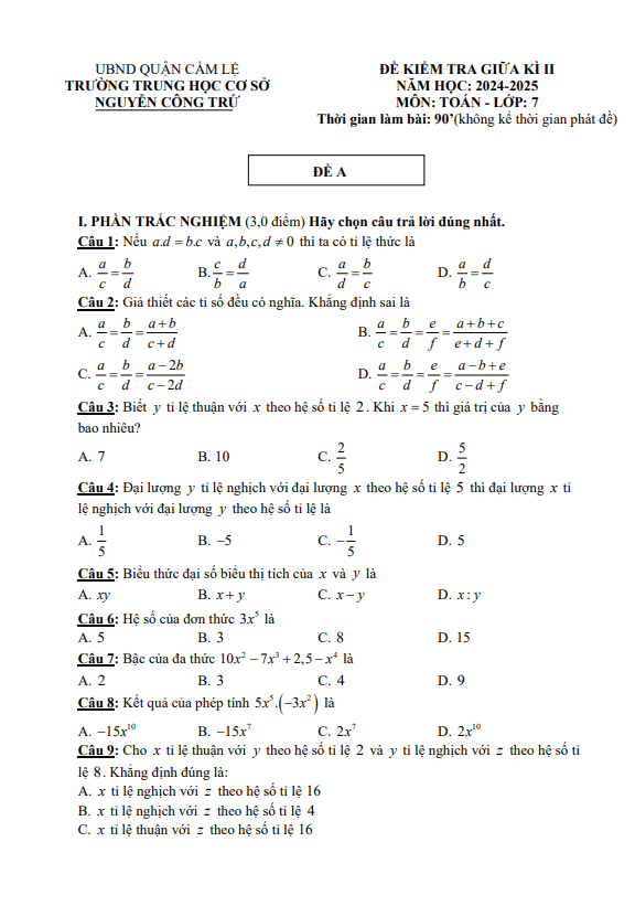 Đề Thi Giữa HK2 Toán 7 Đề giữa kì 2 Toán 7 năm 2024 – 2025 trường THCS Nguyễn Công Trứ – Đà Nẵng