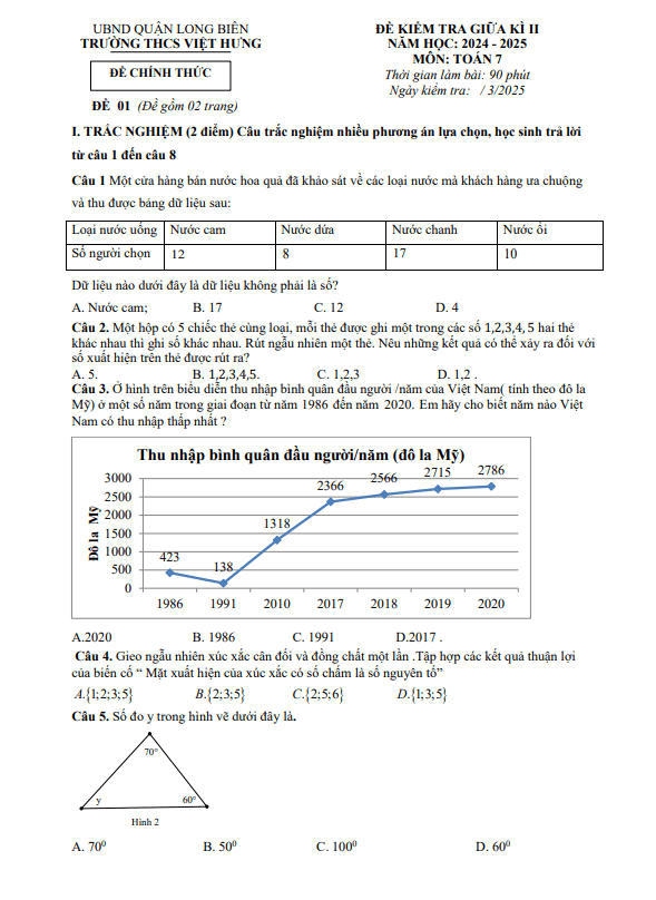 Đề Thi Giữa HK2 Toán 7 Đề giữa kì 2 Toán 7 năm 2024 – 2025 trường THCS Việt Hưng – Hà Nội