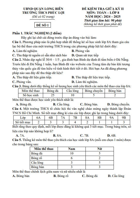 Đề Thi Giữa HK2 Toán 8 Đề giữa học kì 2 Toán 8 năm 2024 – 2025 trường THCS Phúc Lợi – Hà Nội