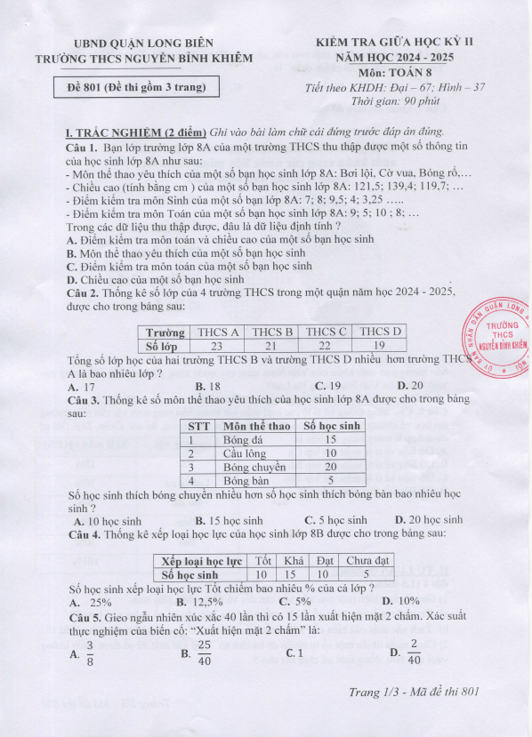 Đề Thi Giữa HK2 Toán 8 Đề luyện tập giữa kì 2 Toán 8 năm 2024 – 2025 trường THCS Ái Mộ – Hà Nội