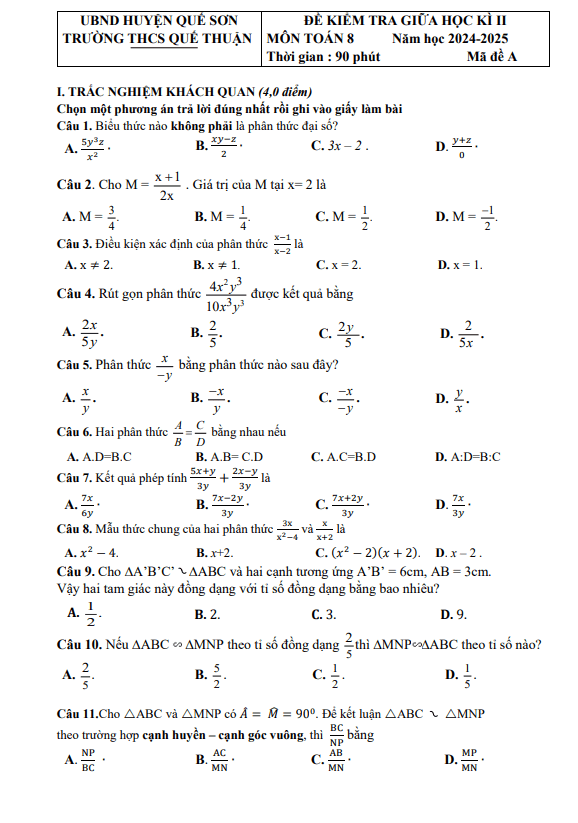 Đề Thi Giữa HK2 Toán 8 Đề giữa học kỳ 2 Toán 8 năm 2024 – 2025 trường THCS Quế Thuận – Quảng Nam