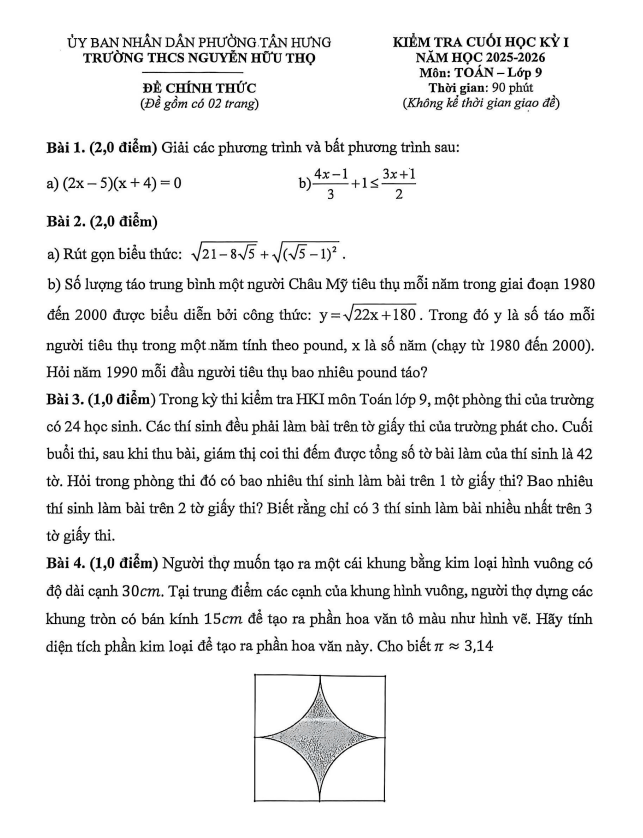 Đề cuối học kỳ 1 Toán 9 năm 2025 – 2026 trường THCS Nguyễn Hữu Thọ – TP HCM 02/01/2026