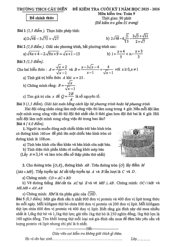 Đề cuối kỳ 1 Toán 9 năm 2025 – 2026 trường THCS Cầu Diễn – Hà Nội 02/01/2026