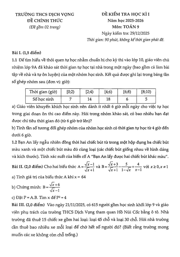 Đề học kì 1 Toán 9 năm 2025 – 2026 trường THCS Dịch Vọng – Hà Nội 02/01/2026