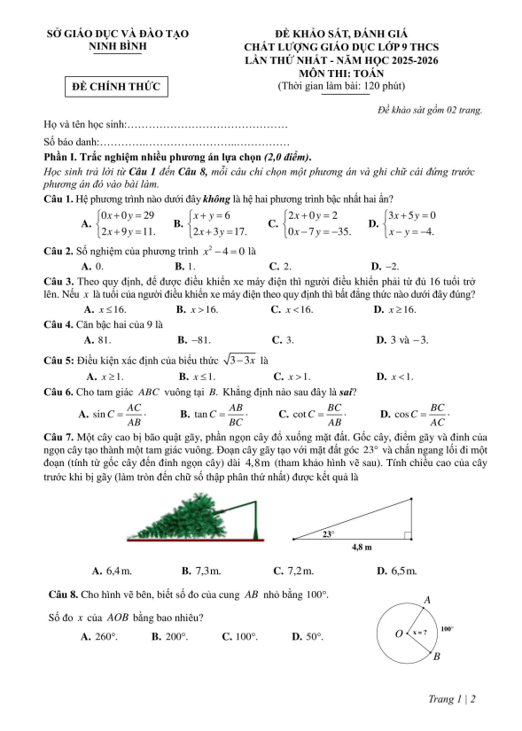 Đề khảo sát Toán 9 lần 1 năm 2025 – 2026 sở GD&ĐT Ninh Bình 02/01/2026