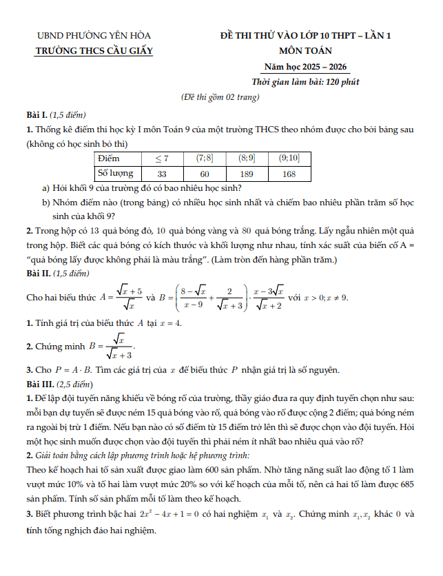 Đề thi thử vào lớp 10 môn Toán lần 1 năm 2026 trường THCS Cầu Giấy – Hà Nội 06/02/2026