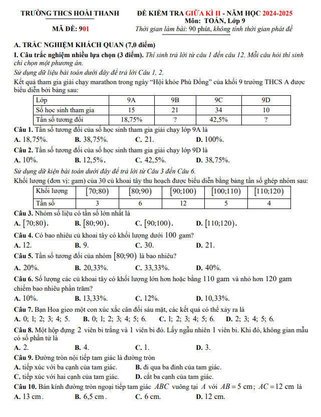 Đề Thi Giữa HK2 Toán 9 Đề giữa học kì 2 Toán 9 năm 2024 – 2025 trường THCS Hoài Thanh – Bình Định