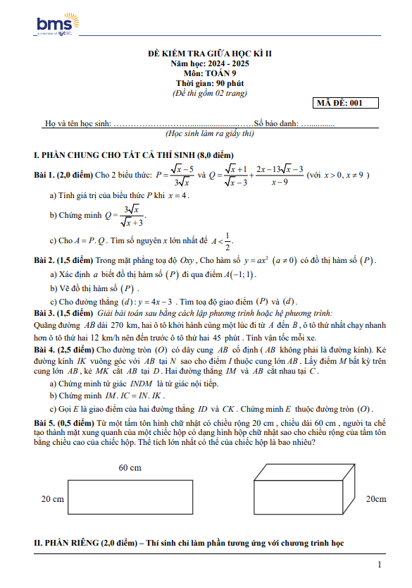 Đề giữa học kì 2 Toán 9 năm 2024 – 2025 trường Ban Mai School – Hà Nội