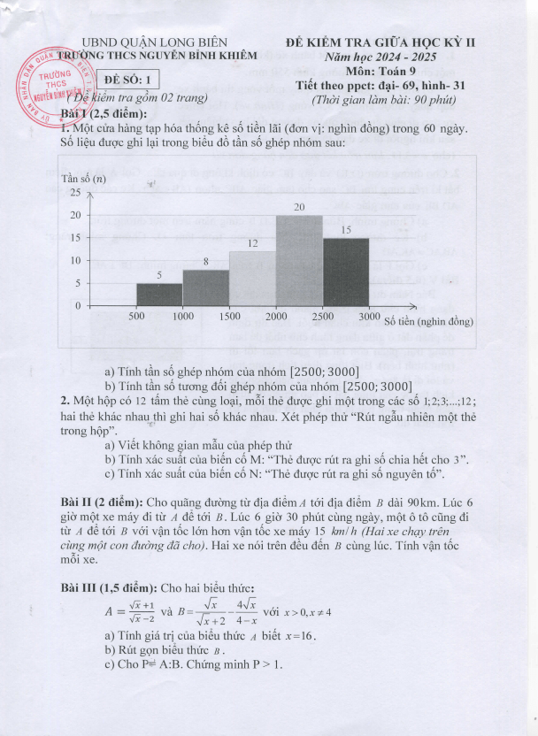 Đề giữa học kỳ 2 Toán 9 năm 2024 – 2025 trường THCS Nguyễn Bỉnh Khiêm – Hà Nội