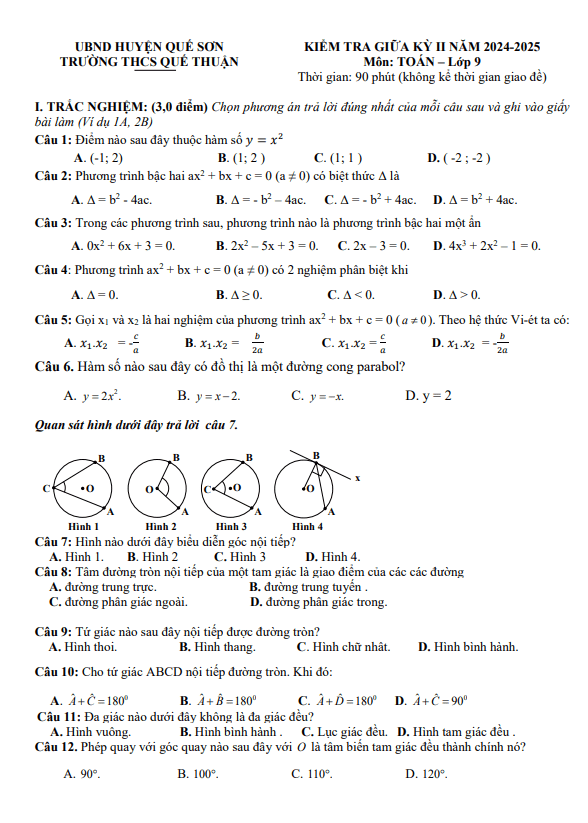 Đề giữa học kỳ 2 Toán 9 năm 2024 – 2025 trường THCS Quế Thuận – Quảng Nam