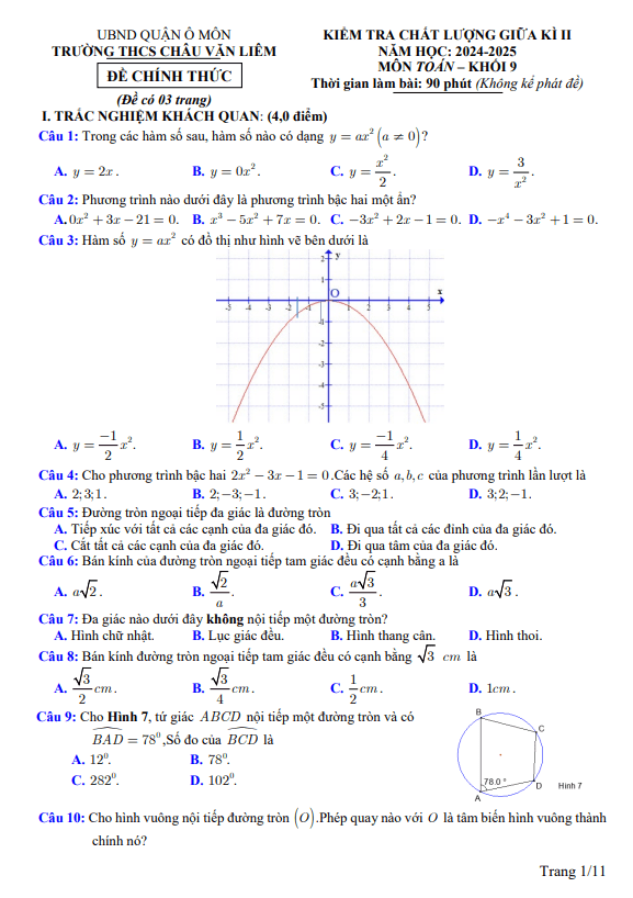 Đề giữa kì 2 Toán 9 năm 2024 – 2025 trường THCS Châu Văn Liêm – Cần Thơ