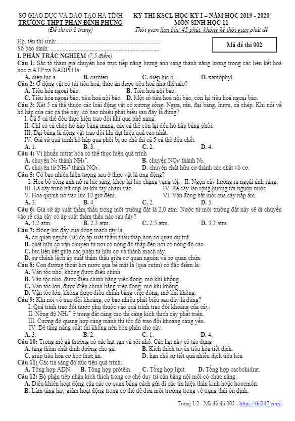 Đề thi HK1 Sinh học 11 năm 2019 – 2020 trường THPT Phan Đình Phùng – Hà Tĩnh