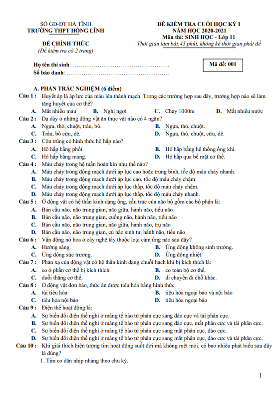 Đề thi cuối học kỳ 1 Sinh học 11 năm 2020 – 2021 trường THPT Hồng Lĩnh – Hà Tĩnh