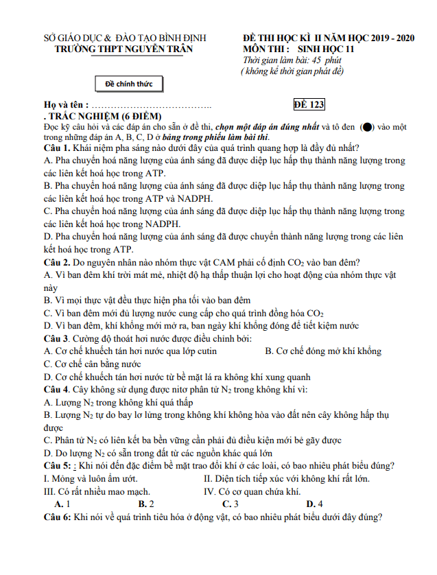 Đề thi học kỳ 1 Sinh học 11 năm 2019 – 2020 trường THPT Nguyễn Trân – Bình Định