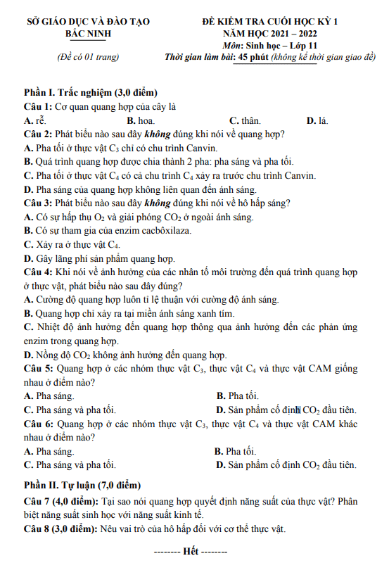 Đề thi cuối học kỳ 1 Sinh học 11 năm học 2021 – 2022 sở GD&ĐT Bắc Ninh