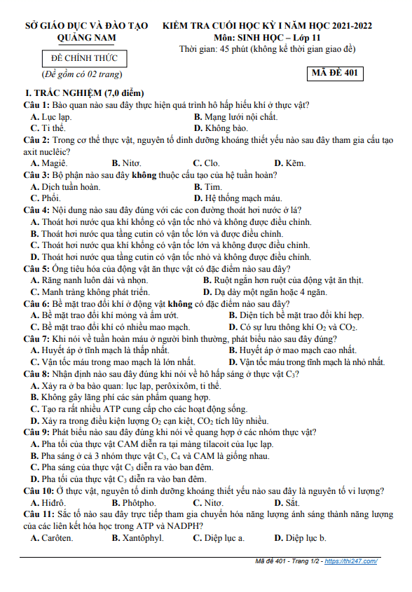 Đề Thi Sinh Học Lớp 11 Học Kì 1 Năm 2021 - 2022 Có đáp án
