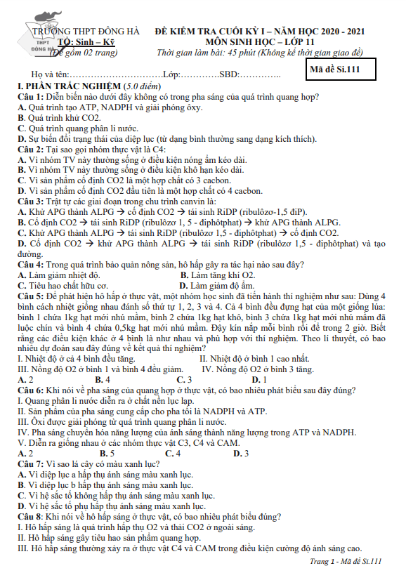 Đề kiểm tra cuối kỳ 1 Sinh học 11 năm 2020 – 2021 trường THPT Đông Hà – Quảng Trị