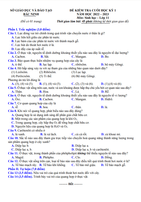 Đề cuối học kỳ 1 Sinh học 11 năm học 2023 – 2024 sở GD&ĐT Bắc Ninh