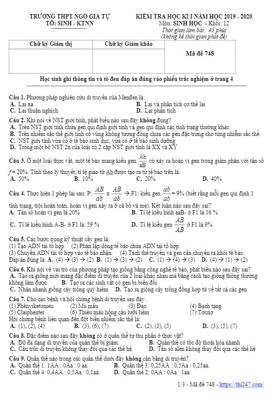 Đề thi cuối kì 1 Sinh học 12 năm 2020 – 2021 trường Lý Tự Trọng – Hà Tĩnh