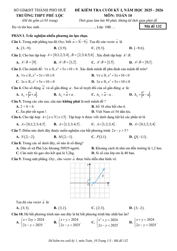 Đề cuối kỳ 1 Toán 10 năm 2025 – 2026 trường THPT Phú Lộc – Huế
