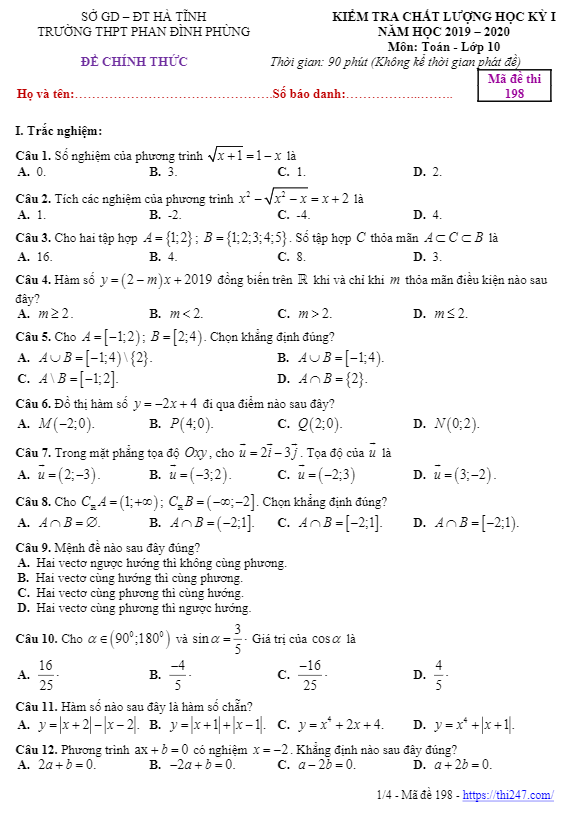 Đề thi HK1 Toán 10 năm 2019 – 2020 trường THPT Phan Đình Phùng – Hà Tĩnh