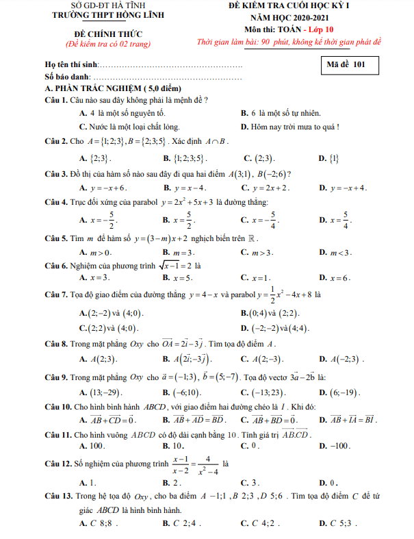 Đề thi cuối học kỳ 1 Toán 10 năm 2020 – 2021 trường THPT Hồng Lĩnh – Hà Tĩnh