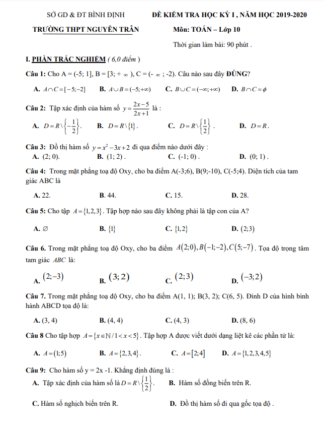 Đề thi học kỳ 1 Toán 10 năm 2019 – 2020 trường THPT Nguyễn Trân – Bình Định